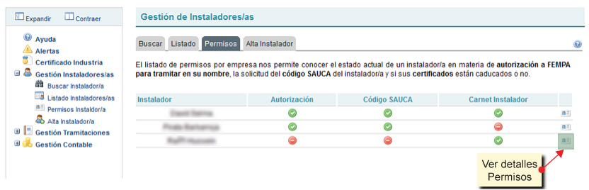 Ver detalles permisos nos permite acceder a los detalles de los permisos de los instaladores, permitiendo conocer el estado de cada una de las autorizaciones, ver los documentos que se generaron o generar automáticamente nuevos documentos de solicitud de los mismos.