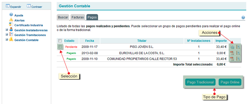 Esta opción permite visualizar un listado de todos los pagos efectuados o pendientes de realizar. Como vimos anteriormente, esto nos permitirá acceder de forma rápida a los pagos pendientes de realizar para pagarlos todos al mismo tiempo.