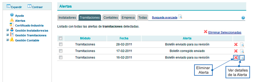 Las Alertas de tramitación, notifican al usuario los eventos que tienen que ver con las tramitaciones realizadas a través del sistema. Estas alertas incluyen: