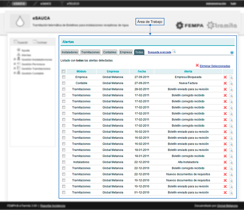 Área de pestañas : ubicada en la zona superior del Área de trabajo, presenta a través de pestañas, las acciones disponibles en cada uno de los módulos. Al seleccionar una pestaña, se accede al Área de datos correspondiente a la acción seleccionada. La pestaña activa se resalta con un gris oscuro.