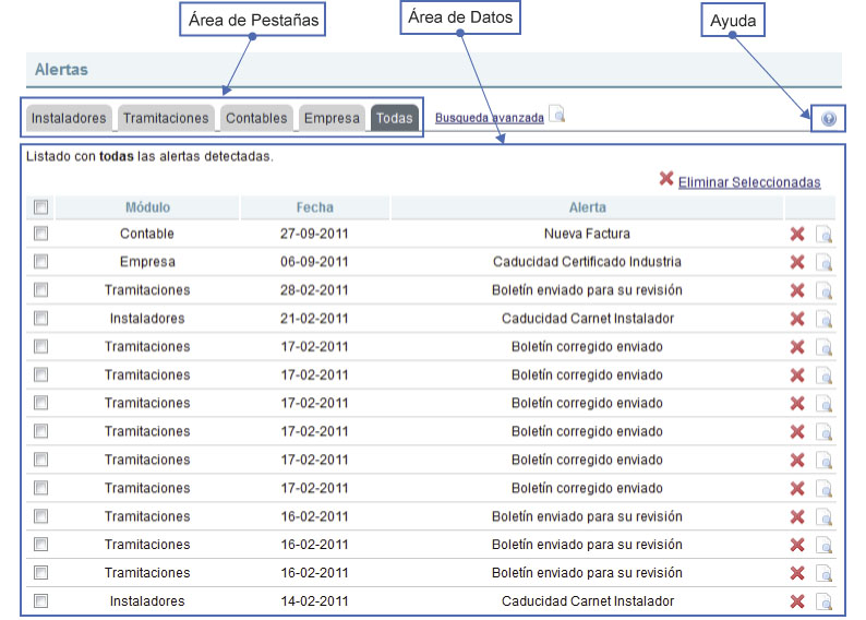 Ayuda : a la derecha del Área de datos, se muestra el icono de ayuda, situando el ratón sobre éste icono se despliega una descripción breve de las pestañas y las leyendas asociadas a los iconos utilizados en cada submódulo.