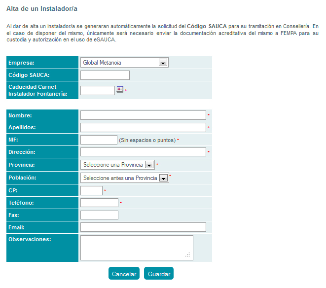 Para dar de alta un instalador, deben completarse los datos requeridos en el formulario que aparece en pantalla, los campos identificados con un asterisco son obligatorios. Luego de completar la información solicitada, se guarda el formulario, en este momento se generarán automáticamente la solicitud del Código SAUCA para su tramitación en Consellería.