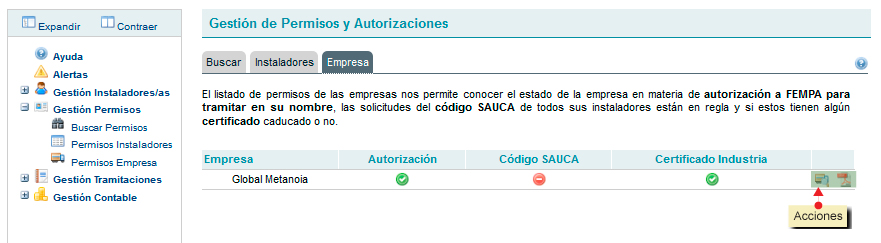 Esta opción nos permite conocer el estado actual de cada empresa en materia de autorización a FEMPA para tramitar en su nombre y si los permisos de sus instaladores están en regla o no.