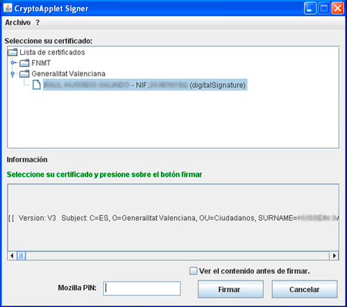 En concreto, el certificado que se utilizará será el de la Autoritat de Certificació de la Generalitat Valenciana (ACCV). A través de su página web http://www.accv.es/descargas-manuales_c.htm, podrá obtener más información acerca de cómo solicitar el certificado o cómo instalarlo en su navegador.
