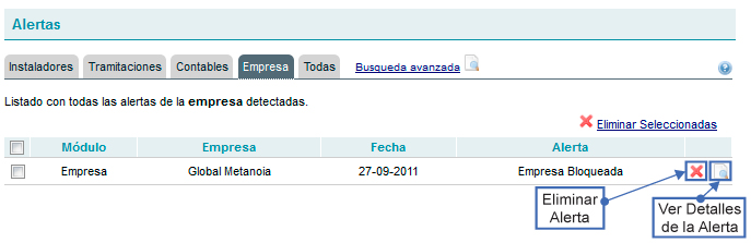 Bloqueo empresa : esta alerta se genera para notificar a la empresa que FEMPA la ha bloqueado su acceso al sistema. La empresa deberá ponerse en contacto con FEMPA para más información.