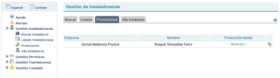 Esta sección muestra el listado de instaladores de todas las empresas que tienen la promoción de tramitación todavía vigente. Será posible acceder a cambiar la fecha de la promoción pulsando sobre la acción del listado que se muestra en la siguiente figura.